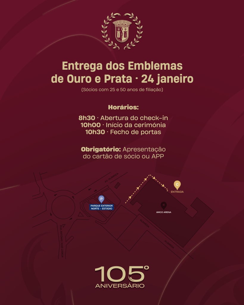 Realiza-se este sábado (24 de janeiro), na AMCO Arena, a cerimónia de entrega dos Emblemas de Ouro e de Prata aos sócios com 50 e 25 anos de filiação, integrada nas comemorações do 105.º Aniversário do SC Braga.