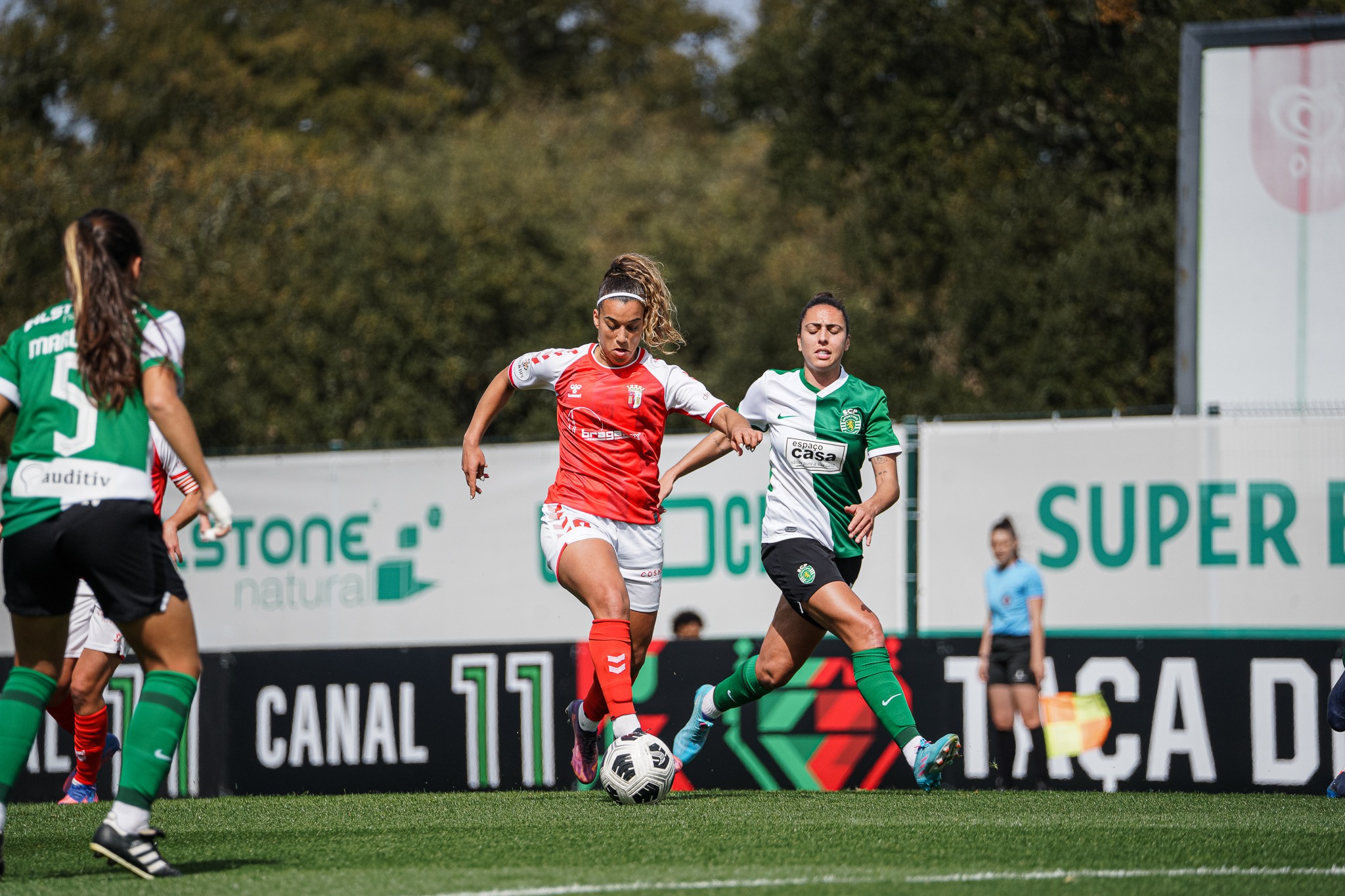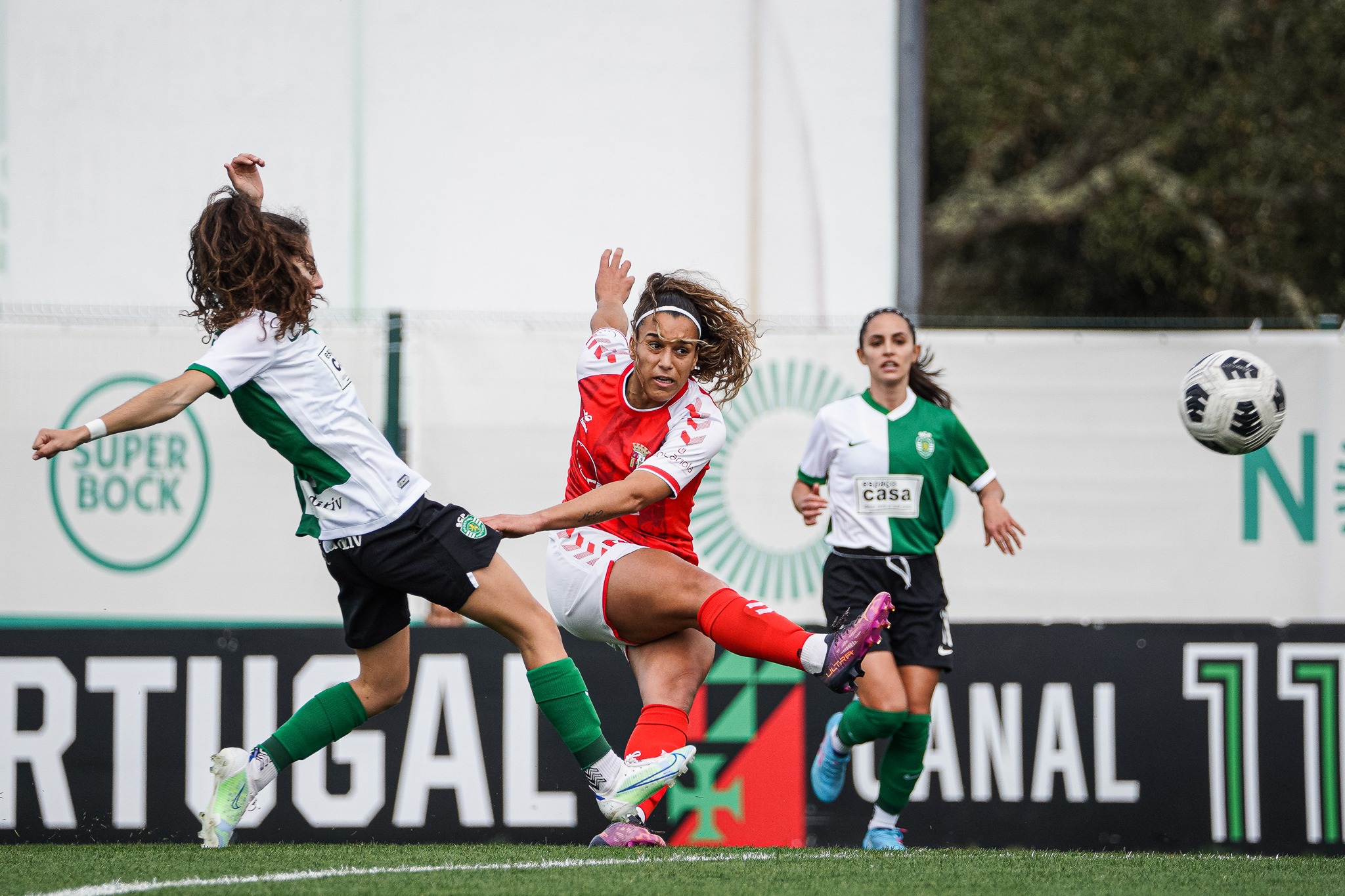 Entrada a todo o gás das Gverreiras. Logo aos 10′, após dois cantos, a equipa de João Marques causou muito perigo junto à baliza do Sporting. Pouco depois, Norton tentou a sorte em duas ocasiões, mas sem sucesso. Grande pressão da turma arsenalista junto à área das ‘leoas’, que não conseguiam organizar o seu processo ofensivo. Mais Braga durante todo o primeiro tempo, mas os golos teimavam em não aparecer. Contudo, contra a corrente do jogo, Diana Silva inaugurou o marcador aos 44′. Um duro golpe para as aspirações arsenalistas, mas estava tudo em aberto para o segundo tempo.
