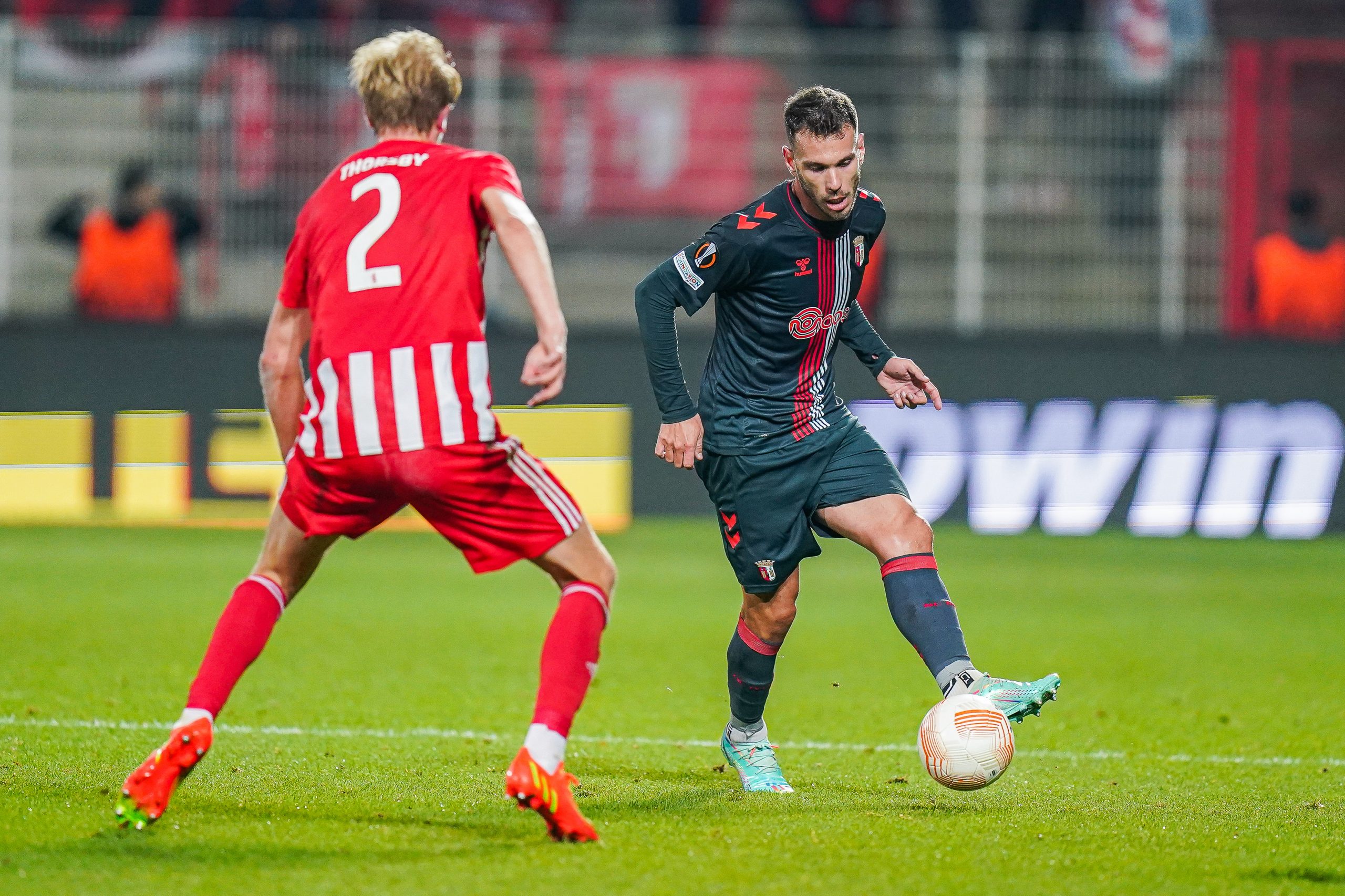 À semelhança da partida no Estádio Municipal de Braga, o equilíbrio marcou a primeira meia hora de jogo. Ambas as equipas dividiram o desafio, com mais posse de bola para o SC Braga. O primeiro lance de perigo surgiu dos pés de Abel Ruiz, aos 36′. Depois da recuperação de bola de Castro, o avançado espanhol rematou cruzado, com o esférico a passar muito perto da baliza de Frederick Ronnow. A formação de Berlim respondeu no lance seguinte. Sheraldo Becker rematou de primeira para uma excelente defesa de Matheus, que evitou o golo da turma alemã.