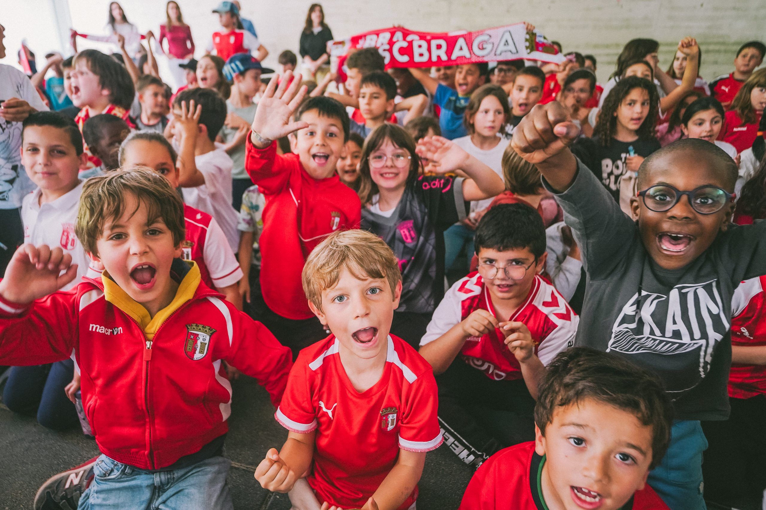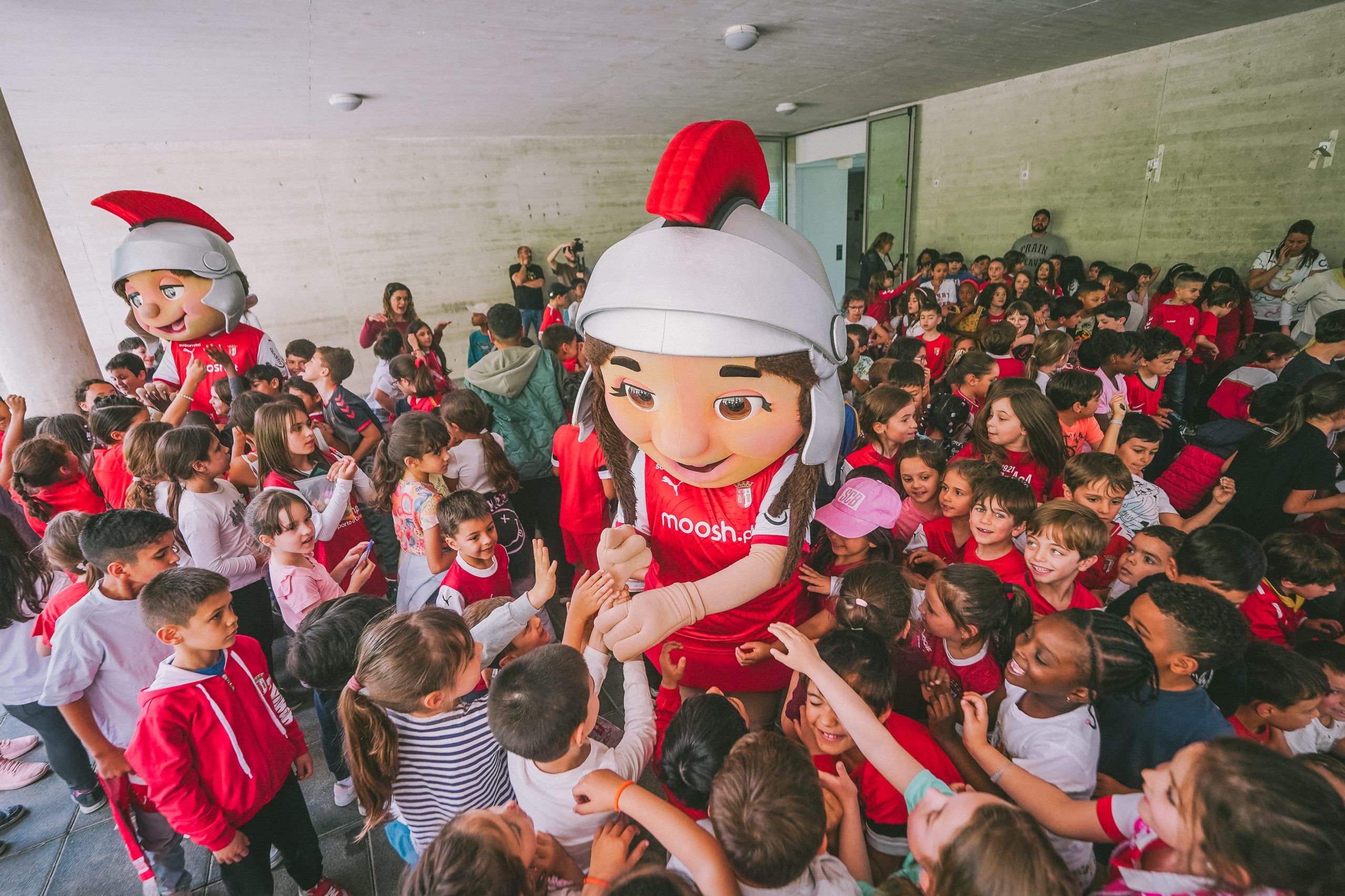Com cerca de 300 alunos ao rubro, respirou-se e sentiu-se Braga no pátio do Centro Escolar de S. Frutuoso. Os capitães Ricardo Horta, Tiago Sá e ainda Afonso Patrão (Equipa masculina), Maria Negrão (Equipa feminina), Tiago Brito (Futsal masculino) e Laura Taborda (Atletismo) distribuíram lembranças, partilharam autógrafos e muitos sorrisos, levando os alunos do pré-escolar e 1.º Ciclo à loucura. A presença das mascotes do SC Braga (Bracaro e Augusta) coloriram ainda mais esta ação promovida pelo Clube.