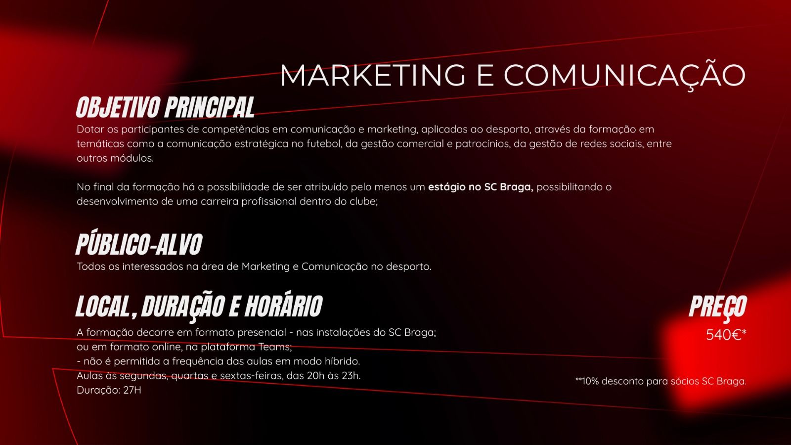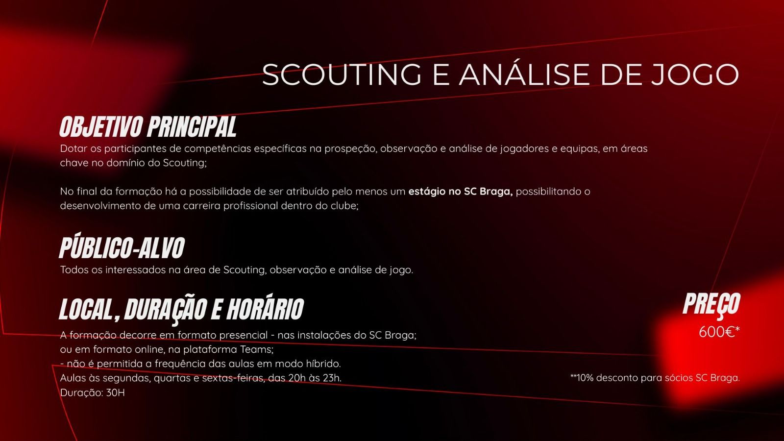 - Os conteúdos da formação são propriedade do SC Braga e do formador. Sempre que possível será disponibilizada a apresentação em PDF e/ou vídeos que possam ter sido apresentados durante a mesma;